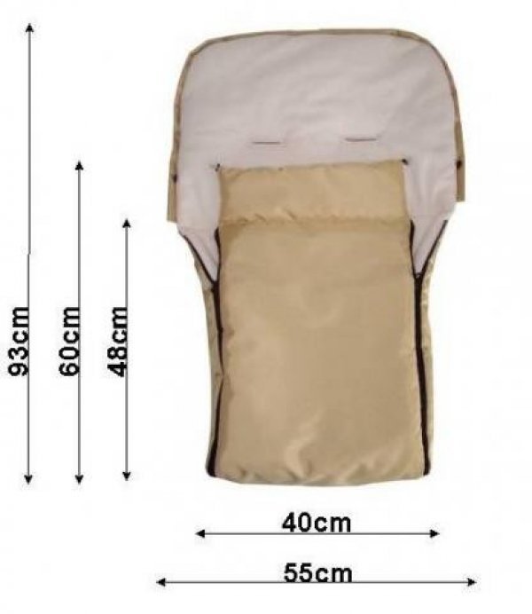Tento fusak je z vrchnej časti ušitý z dobre umývateľné látky, ktorá sa používa pri výrobe kočíkov. Vnútorná vyplnenie je z fleecu. Táto látka je teplá, priedušná a nehryzie. Fusak je zo všetkých strán vybavený zipsy, ktoré Vám umožní dobrý prístup k dieťaťu za všetkých okolností. Na fusaku sú zo zadnej strany otvory umožňujúce prestrčenie pásov autosedačiek a bezpečnostných pásov kočíkov. Celková dĺžka fusaku je 93 cm, šírka zapnutého 55 cm a rozopnutého 110 cm, dĺžka od konca fusaku po krytia ku krku je 60 cm, zahýbací lem pod krkom je 11 cm, šírka v rozšírenom mieste pod hlavičkou je 55 cm.