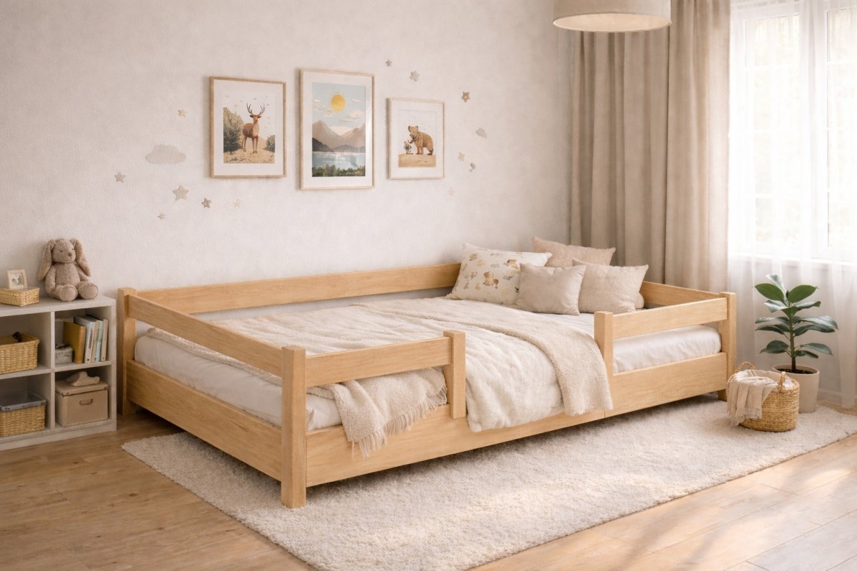 Táto posteľ predstavuje ideálnu voľbu pre modernú detskú izbu, kde sa kladie dôraz na bezpečnosť, funkčnosť a nadčasový dizajn. Tento model je dodávaný vrátane kvalitného roštu a bol starostlivo navrhnutý podľa princípov Montessori pedagogiky, ktoré podporujú samostatnosť a prirodzený rozvoj dieťaťa. Konštrukcia postele je vyrobená z masívneho borovicového dreva, ktoré vyniká svojou pevnosťou, odolnosťou a dlhou životnosťou. Povrch dreva je ošetrený ekologickými farbami na vodnej báze - sú bez zápachu, zdravotne nezávadné a šetrné k životnému prostrediu, čo zaručuje zdravé prostredie pre vaše dieťa. Pre maximálnu bezpečnosť je posteľ vybavená obvodovými ochrannými bariérkami a praktickou kratšou bariérkou so vstupom, ktorá je nastaviteľná a umožňuje montáž na ľavú, pravú stranu, alebo jej úplné odobratie podľa aktuálnych potrieb a dispozícií izby. Zaoblené hrany a precízne spracovanie eliminujú riziko zranenia a poskytujú vysoký komfort pri každodennom používaní. Elegantný a čistý dizajn ľahko zapadne do akéhokoľvek interiéru detskej izby a je možné ho kombinovať s ďalšími kusmi nábytku v rôznych štýloch. Posteľ je dostupná v niekoľkých veľkostiach aj farebných prevedeniach, aby dokonale zodpovedala vašim požiadavkám a priestoru. Vďaka svojej variabilite a premyslenej konštrukcii je skvelou voľbou, ktorá rastie spolu s Vaším dieťaťom a prispôsobuje sa jeho vývoju aj meniacim sa potrebám.