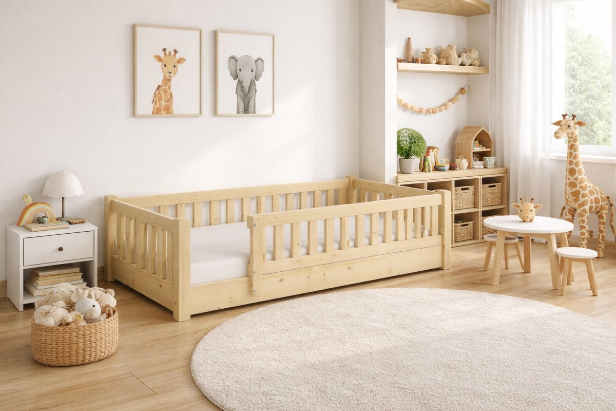 Montessori detská posteľ z masívnej borovice s ochrannými bariérkami - bezpečie, kvalita a podpora samostatnosti vášho dieťaťa Objavte praktickú a bezpečnú Montessori posteľ, ktorá podporuje prirodzenú samostatnosť a rozvoj dieťaťa podľa princípov Montessori pedagogiky. Táto detská posteľ je vyrobená z kvalitného masívneho borovicového dreva, ktoré sa vyznačuje pevnosťou, odolnosťou a dlhou životnosťou. Borovicový masív navyše prináša do interiéru prírodný vzhľad a zdravé prostredie bez škodlivých látok. Bezpečná a funkčná konštrukcia Ochranné bariérky po troch stranách (výška 16 cm) zaisťujú maximálnu bezpečnosť počas spánku aj hry. Dieťa sa nemusí báť pádu, a rodičia môžu byť pokojní. Posteľ je nízko pri zemi – výška bočnice od podlahy je iba 6 cm a rošt je uložený vo výške 2,5 cm nad zemou. To deťom umožňuje ľahké a bezpečné vyliezanie aj zaliezanie do postele bez potreby pomôcť dospelých. Otvorená strana bez zábrany podporuje voľný pohyb dieťaťa, čím napĺňa základné princípy Montessori Rozmery postele Celková šírka konštrukcie je 122 cm – ideálna pre matrac s rozmermi 120 x 200 cm (alebo podľa potreby na zákazku). Výška čel je 29 cm Odporúčaná výška matraca: 10–12 cm, pre maximálnu bezpečnosť v kombinácii s bariérkami. Kvalitné materiály a spracovanie Vyrobená z masívu borovice - 100% prírodný materiál, ekologicky šetrný a zdravotne nezávadný. Povrch je možné ošetriť prírodnými olejmi, voskami alebo lakmi, ktoré spĺňajú normy pre detský nábytok. Zaoblené hrany a starostlivo opracované plochy chránia deti pred zranením. Montessori filozofia Táto posteľ rešpektuje Montessori prístup k výchove - umožňuje dieťaťu samostatne rozhodovať o svojom odpočinku a pohybe. Podporuje nezávislosť a zároveň vytvára bezpečný a útulný priestor na spánok, hru a relaxáciu. Výhody na prvý pohľad: Vysoko kvalitný borovicový masív Ochranné bariérky po troch stranách Nízka konštrukcia - vhodná pre malé deti od útleho veku Podpora samostatnosti podľa Montessori zásad Pevný rošt v cene Jednoduchá montáž - zvládne ju každý rodič Vhodná pre chlapcov aj dievčatá