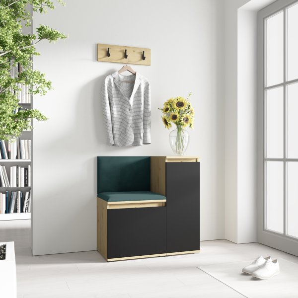 Zostava nábytku EMI so sadou čalúnených panelov v modernom dizajne sa bude skvele hodiť do predsiene ako jedinečná a funkčná šatníková skriňa, botník a vešiak v jednom. Čalúnené panely sa montujú priamo na stenu pomocou lepidla, nanopásky alebo sychými lepiacimi zipsami, ktoré nájdete v našej ponuke TU. Objavte výhody šatníka EMI: čalúnené panely 50x40 cm - 2x botník s poličkou Vešiak so šiestimi kovovými háčikmi čierne nohy s výškou 2 cm Farba: skrine - čierna / dub artisan čalúnené panely - podľa zvolenej varianty Materiál nábytku: lamino 16mm Materiál panelov: Nábytková doska - doska hrubá 7-8 mm, vyrobená z veľmi jemných drevených vlákien, lisovaná pod vysokým tlakom a vysokou teplotou. Vďaka svojim parametrom je panel pevný a odolný a má dobrú tepelnú a zvukovú izoláciu. Jeho nízka hmotnosť uľahčuje montáž na stenu. Čalúnická pena - vysoko kvalitná antialergická pena s hygienickým certifikátom PZH® (jedná sa o posúdenie daného produktu z hľadiska jeho bezpečnosti pre ľudí, alebo bezpečnosti produktu pre životné prostredie). Vlastnosti čalúnickej peny zaisťujú: vysoký koeficient absorpcie zvuku, dobrú tepelnú izoláciu, pružnosť a nízku hmotnosť. Čalúnická tkanina - obľúbená velúrová poťahová látka TRINITY. Jej charakteristickým znakom je jemná štruktúra a povrch pokrytý jemným páperím - mäkký a príjemný na dotyk. Obľúbený je vďaka jemnému tieňovaniu materiálu a matným farbám. Odolné proti oderu, žmolkovaniu a svetlu. Tkanina má obmedzené schopnosti absorbovať tekutiny, čo má pozitívny vplyv na jej udržanie v čistote. 100% PES s gramážou 355 g/m2. Máte záujem o veľkoobchodnú spoluprácu? Alebo chcete získať zaujímavú cenovú ponuku na väčšie množstvo našich produktov? Obchodníkom a firmám, ponúkame možnosť nákupu na veľkoobchodné ceny. Zašlite dopyt na ondera@seznam.cz, veľmi radi sa Vám budeme venovať. Poprípade sa zaregistrujte ("POUŽÍVATEĽ" - v hornej lište), vyplníte osobné údaje a zakliknete "MÁME ZÁUJEM O VEĽKOOBCHODNÚ SPOLUPRÁCU" a zadáte fakturačné údaje. Po ich kontrole, Vám bude povolený prístup do veľkoobchodu.