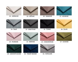 - Čalúnická tkanina - obľúbená velúrová poťahová látka TRINITY. Jej charakteristickým znakom je jemná štruktúra a povrch pokrytý jemným páperím - mäkký a príjemný na dotyk. Obľúbený je vďaka jemnému tieňovaniu materiálu a matným farbám. Odolné proti oderu, žmolkovaniu a svetlu. Tkanina má obmedzené schopnosti absorbovať tekutiny, čo má pozitívny vplyv na jej udržanie v čistote. 100% PES s gramážou 355 g/m2.