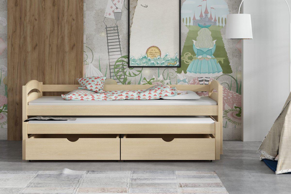 Objavte dokonalú kombináciu elegancie a praktičnosti s našou posteľou z masívu borovice. Táto nádherná posteľ prináša do vašej spálne, alebo detskej izby, príjemnú atmosféru a trvanlivosť vďaka kvalitnému drevu, z ktorého je vyrobená. S prídavnou výsuvnou posteľou získate navyše flexibilitu pre hostí alebo pre rozšírenie priestoru v izbe podľa vašich potrieb. Urobte svoju izbu dokonalým s našou posteľou z masívu borovice!" A to nie je všetko! Pri nákupe tejto postele získate tiež rošty zadarmo, aby ste si mohli užívať nielen pohodlie, ale aj správnu podporu pre zdravý spánok. Vďaka rozšírenému komfortu a praktickým vlastnostiam našej postele z masívu borovice sa vaša spálňa stane dokonalým útočiskom pre relaxáciu a odpočinok. Nečakajte a urobte svoju spálňu kompletnú s našou exkluzívnou posteľou z masívu borovice ešte dnes!" Balenie obsahuje: posteľ z masívu borovice s výsuvnou druhou posteľou latkové rošty do oboch posteľou šuplíky na kolieskach - 2 ks spojovací materiál na kompletnú stavbu postele Odporúčame k tomuto produktu dokúpiť: Matrac - nakupujte - TU Plachty - nakupujte - TU Nočné stolíky, komody atď. - nakupujte - TU Prikrývky, vankúše, chrániče, toppery - nakupujte - TU