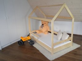 Posteľ domeček pre väčšie deti s ochrannou bariérky, ktorá chráni dieťa pred pádom. Táto posteľ je vyrobená z masívneho borovicového dreva. Súčasťou tejto postieľky je rošt. Posteľ je lakovaná nezávadným ekologickým lakom, vhodným pre styk s dieťaťom. Súčasťou je pevný a stabilný rošt. Znížený prah, umožňuje používať túto posteľ aj pre najmenšie deti. Nosnosť tejto postele je 80 kg. Síla masívu 2,5 cm. Dekorácie nie sú súčasťou. Vo "PRÍSLUŠENSTVU" ( vpravo ), máte možnosť zakúpiť rôzne typy matracov. Balenie obsahuje: posteľ s bariérami latkový rošt spojovací materiál