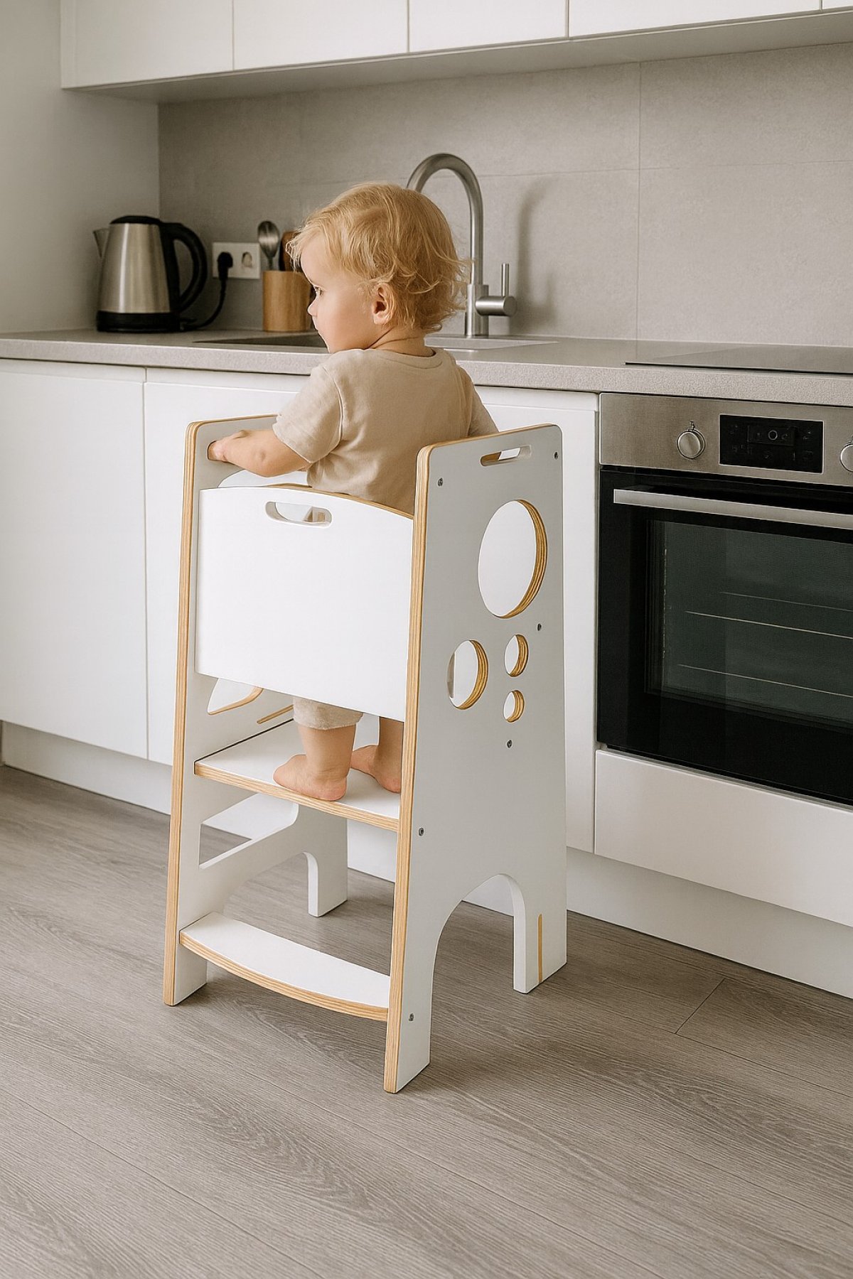 Súprava drevených vešiakov je praktickou dekoráciou izby. Jednak umožňuje udržovať oblečenie v lepšom stave a poriadku a jednak pekne vyzerá. Celok v módnych bielych a šedých farbách. Celý je vyrobený z lakovaného dreva a kovu. Výrobok obsahuje 4 kusy ramienok, každý trochu iný, ale dohromady tvorí harmonický set. Hlavná časť vešiaka je pomerne silná a má na oboch stranách výrezy na uľahčenie zavesenia oblečenia s uchami, napríklad sukňou. Navyše na prednej strane drevený, ozdobný prvok s hviezdou alebo slonom. CE vyhlásenie o zhode