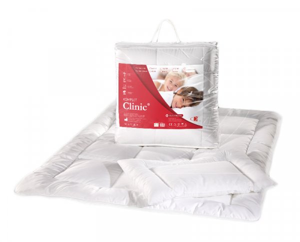 Tento set obsahuje perinku a vankúšik. Rad výrobkov Clinic uchováva po dlhú dobu vysokou úžitkovou hodnotou týchto výrobkov. Sú vhodné pre pranie pri vysokých teplotách, čo účinne eliminuje škodlivé, pre ľudské zdravie alergické látky. Preto je táto rada výrobkov vhodná najmä pre nemocnice, kliniky, sanatóriá, LDN, hotely a penzióny. Jednoduchá údržba týchto výrobkov šetrí čas, pričom nedochádza k poškodeniu tkaniny poťahu a výplne a pritom zachováva sterilnosť týchto výrobkov.